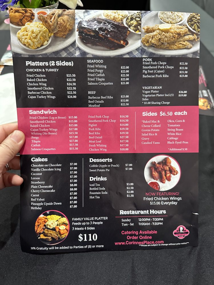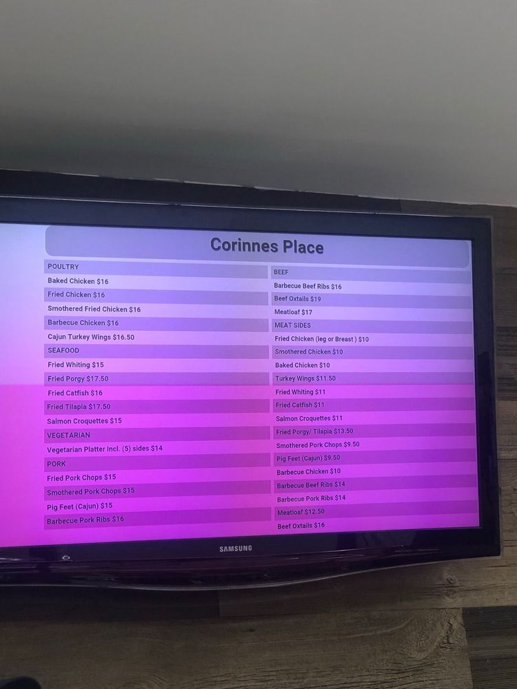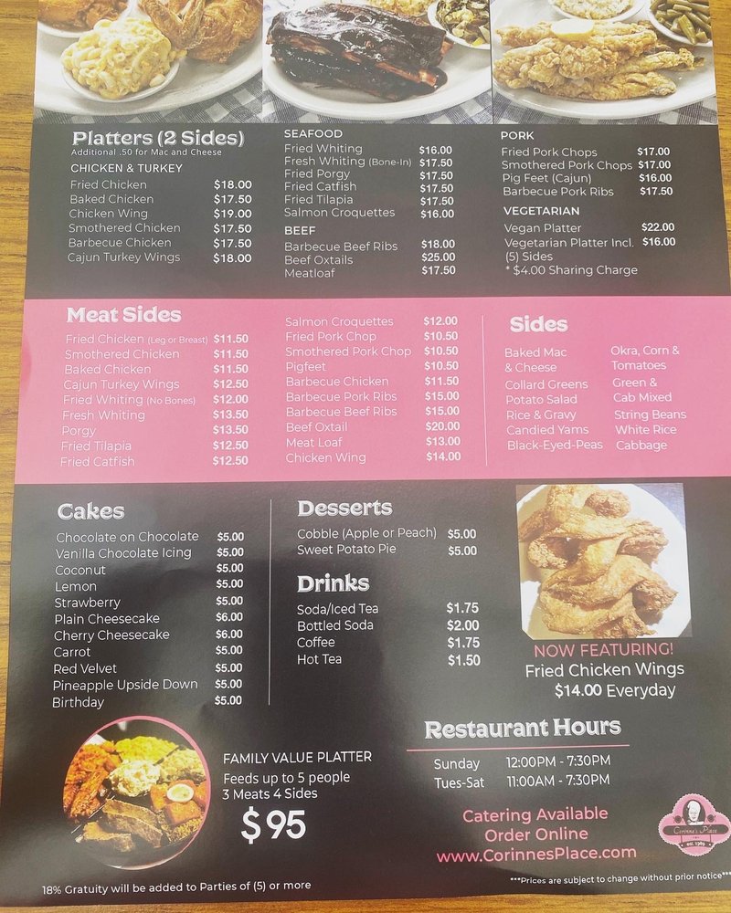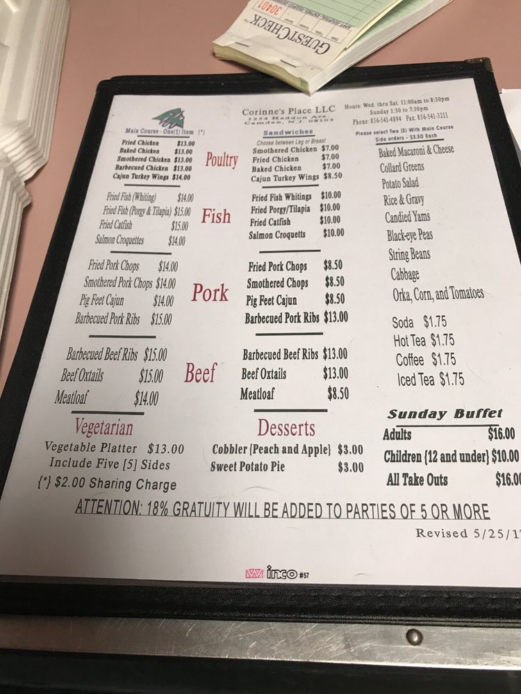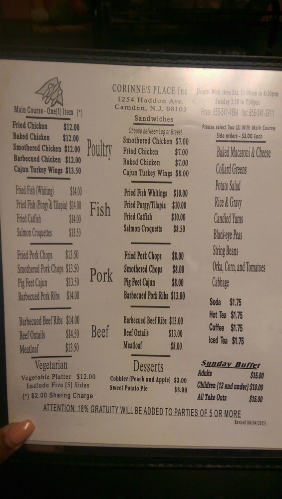 Introducing "Corinne’s Place," a soul food restaurant located in Camden, NJ. With a diverse menu offering soul food, barbeque, and Southern cuisine, Corinne’s Place provides a wide range of options for all preferences. From sandwiches like the Smothered Chicken Sandwich to vegetarian options like the Vegetable Platter, there's something for everyone. The Family Value Platter is a standout, offering a mix of meats and sides perfect for sharing. Customer reviews rave about the quality of the food, with mentions of dishes like smothered pork chops, collard greens, and baked mac and cheese. Despite being located in a less desirable neighborhood, Corinne’s Place shines through its delicious food, friendly staff, and convenient amenities. Whether dining in or taking out, Corinne’s Place promises a satisfying and authentic soul food experience.